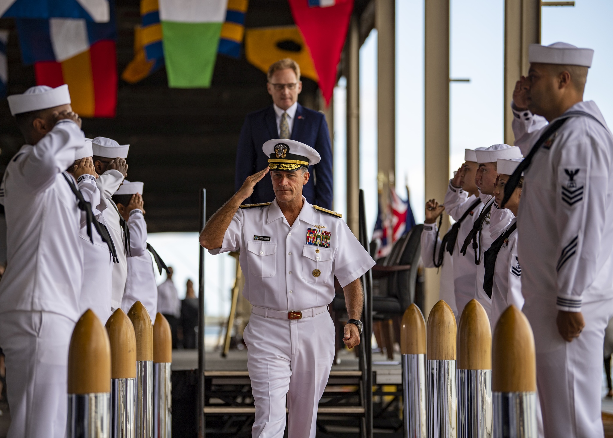 755k | ADM John C. Aquilino, front, commander of U.S. Pacific Fleet, and Acting Secretary of the Navy Thomas B. Modly depart the stage following the unveiling of the new Gerald R. Ford-class aircraft carrier, the future USS Doris Miller (CVN-81), at a Dr. Martin Luther King Jr. Day celebration event at Joint Base Pearl Harbor-Hickam. U.S. Navy photo by Mass Communication 2nd Class Justin R. Pacheco (# 200120-N-NU281-1277). |
