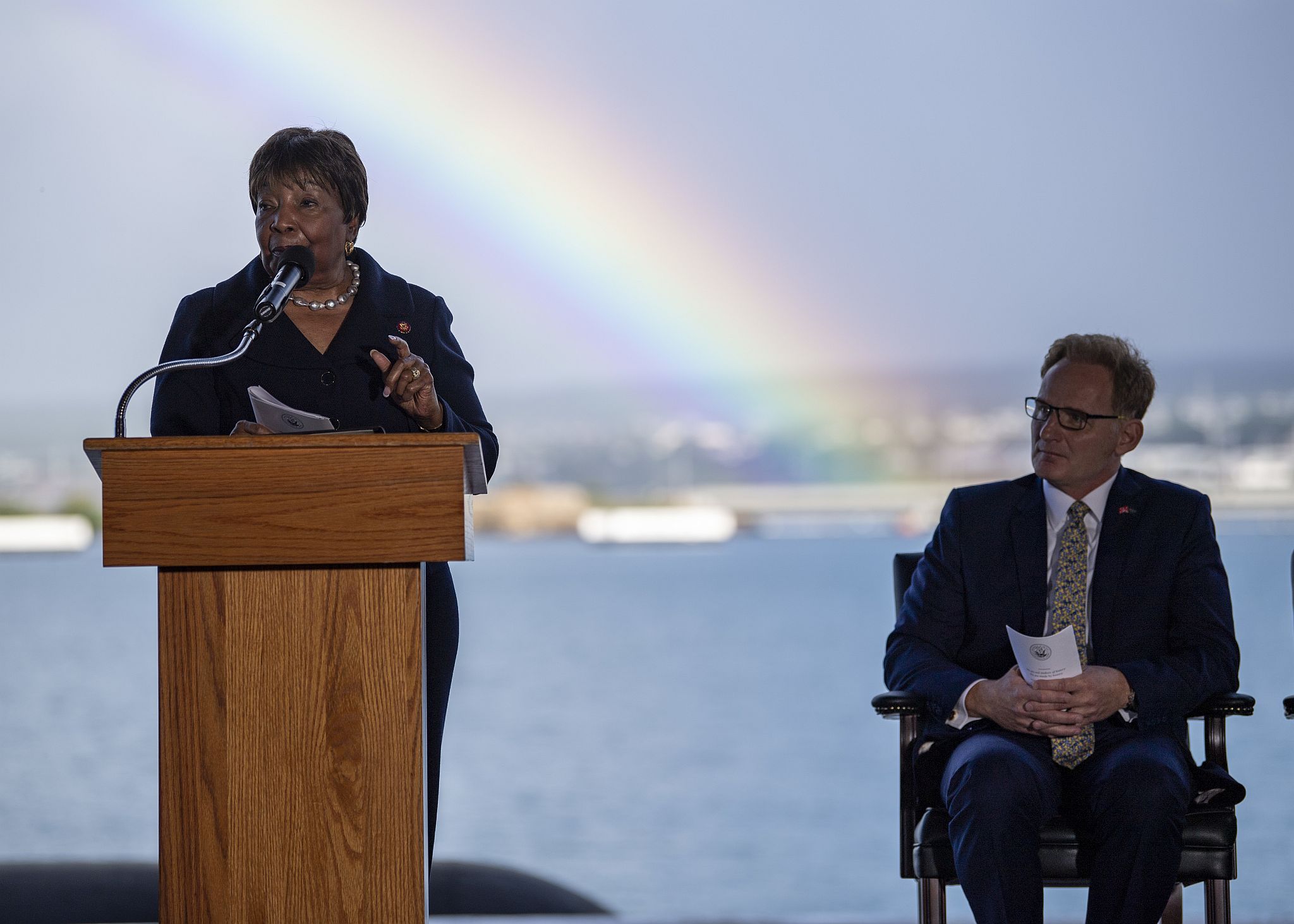254k | U.S Rep. Eddie Bernice-Johnson, left, from the 30th Congressional district of Texas, delivers remarks during the unveiling of the new Gerald R. Ford-class aircraft carrier USS Doris Miller (CVN-81) at a Dr. Martin Luther King Jr. Day celebration event at Joint Base Pearl Harbor-Hickam, as Acting Secretary of the Navy Thomas B. Modly looks on. U.S. Navy photo by Mass Communication 2nd Class Justin R. Pacheco (# 200120-N-NU281-1122). |