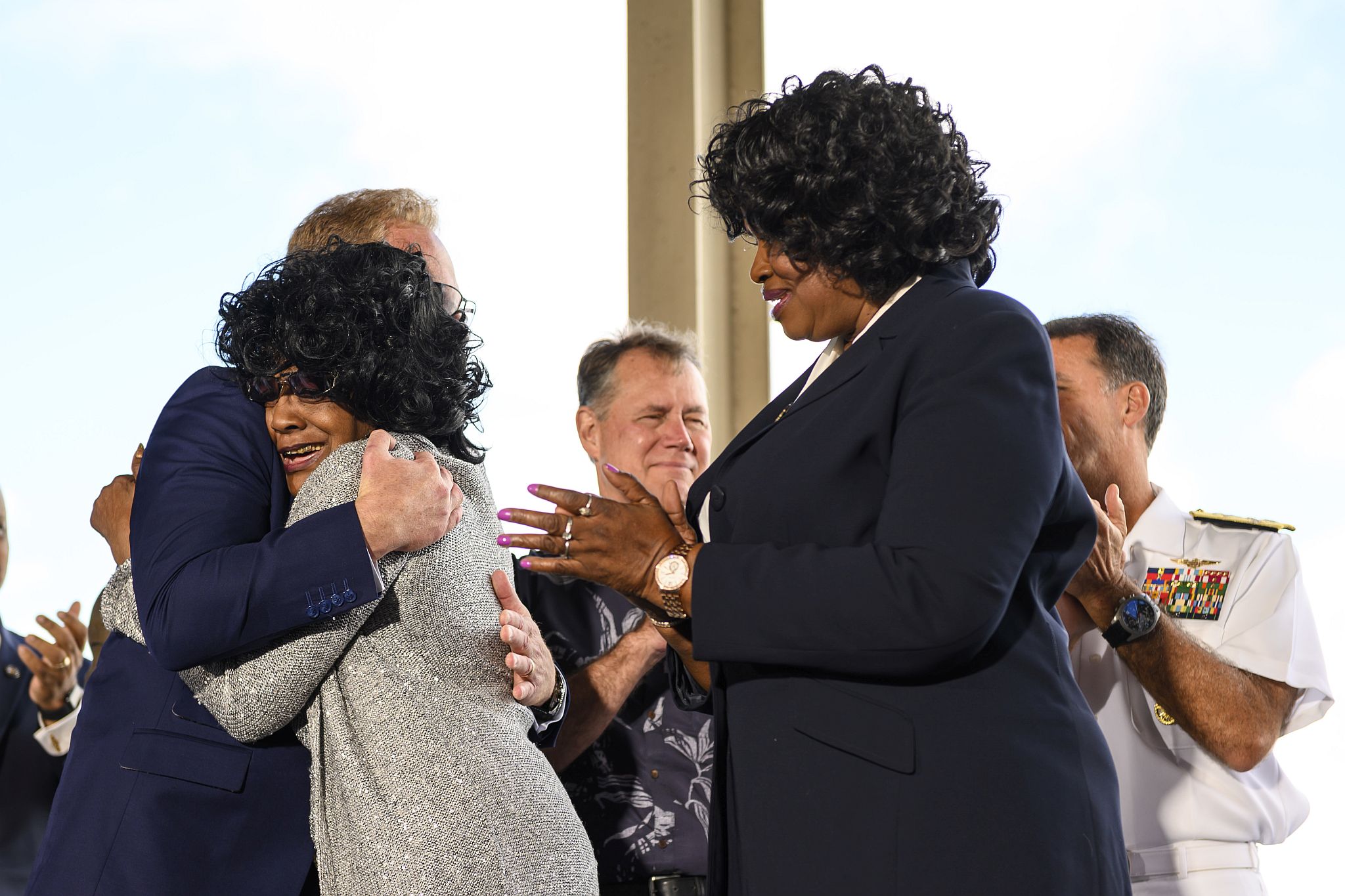 362k | Brenda Haven, niece of World War II hero Doris "Dorie" Miller, hugs Acting Secretary of the Navy Thomas B. Modly after the unveiling of the new Gerald R. Ford-class aircraft carrier USS Doris Miller (CVN-81), 20 January 2020. U.S. Navy photo by Mass Communication Specialist 2nd Class Alexander C. Kubitza (# 200120-N-PM193-2283). |