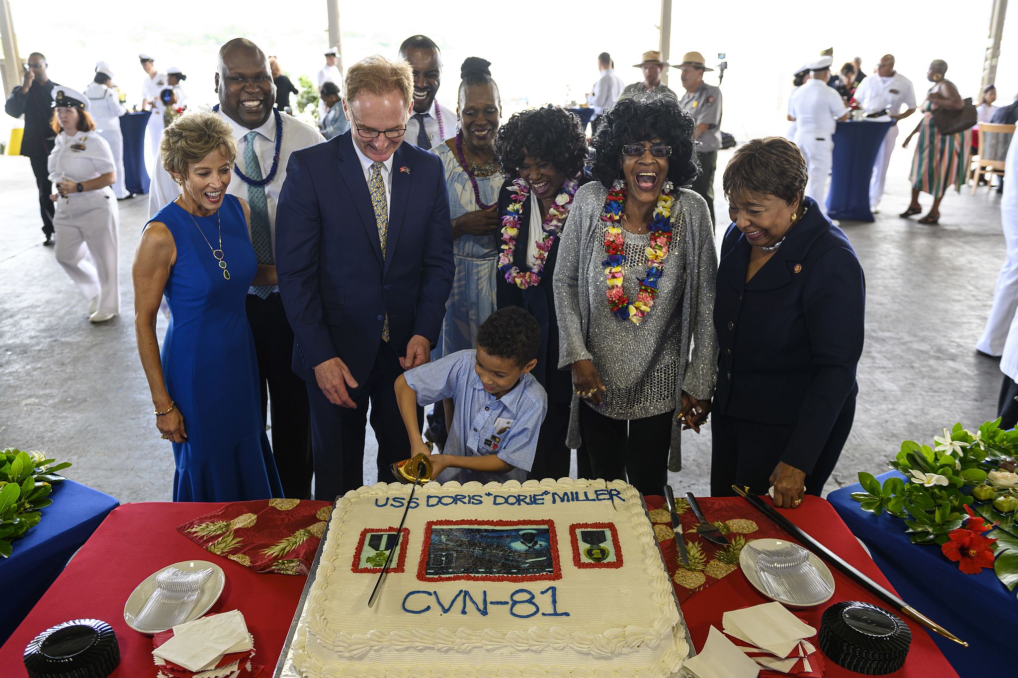 507k | Emrys Bledsoe, bottom, great-great-grandnephew of World War II hero Doris "Dorie" Miller, attempts to cut a cake next to Acting Secretary of the Navy Thomas B. Modly, third from left; Mrs. Robyn Modly, left; Rep. Eddie Bernice-Johnson, right; and other Miller relatives at a Martin Luther King Jr. Day celebration event on Joint Base Pearl Harbor-Hickam, 20 January 2020. The ceremony ended after the unveiling of the future Gerald R. Ford-class aircraft carrier USS Doris Miller (CVN-81). U.S. Navy photo by Mass Communication Specialist 2nd Class Alexander C. Kubitza (# 200120-N-PM193-2419). |