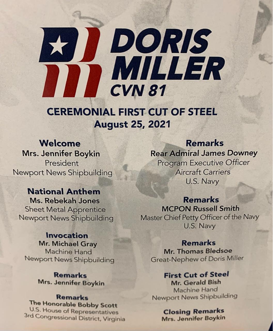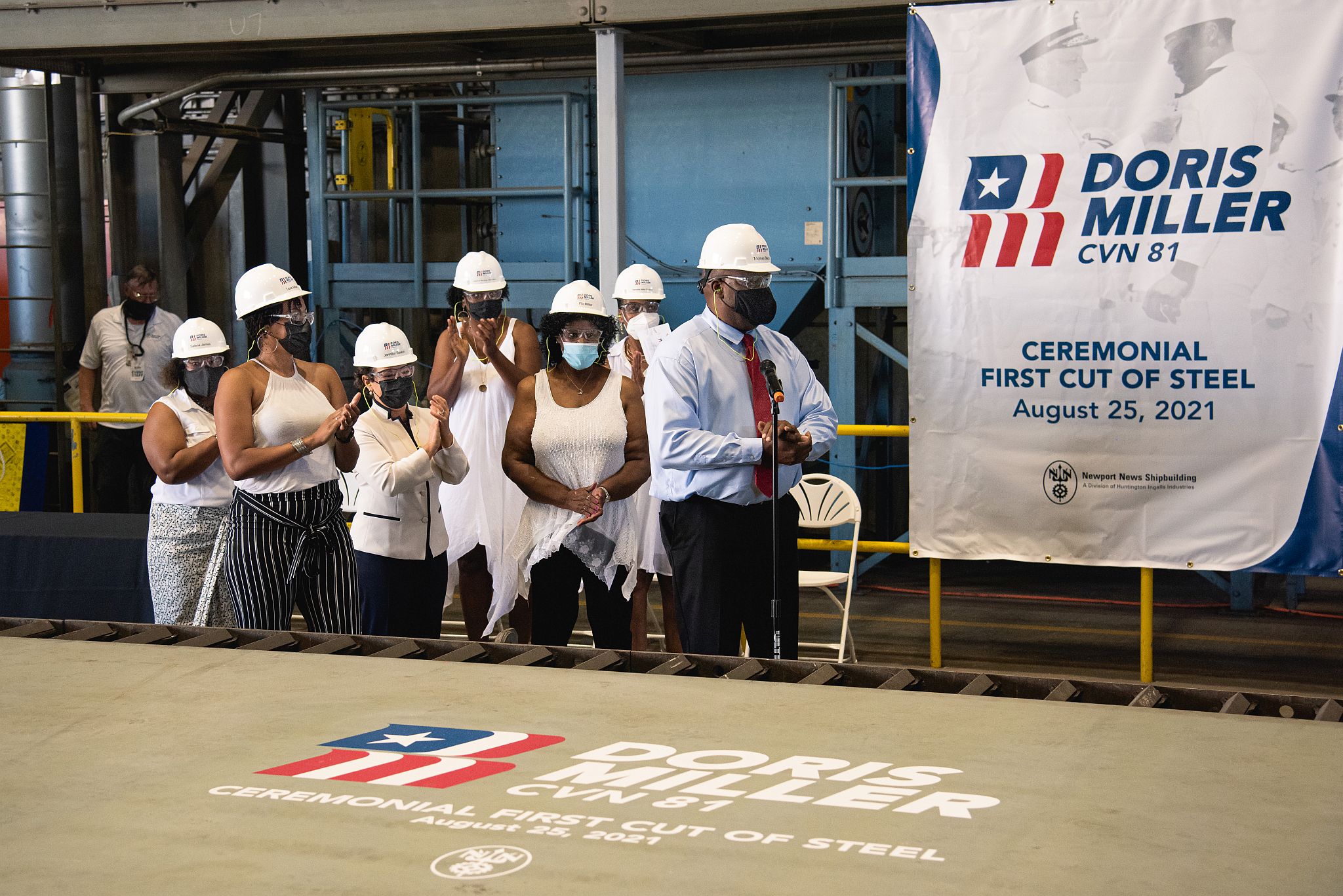 531k | Huntington Ingalls Industries hosted a ceremonial event at its Newport News Shipbuilding division, 25 August 2021, that marked the first construction milestone in the life of the aircraft carrier Doris Miller (CVN-81). During a small ceremony held inside of a manufacturing facility, Thomas Bledsoe, the great nephew of the ship's namesake, gave the order to "cut that steel" to shipbuilder Gerald Bish, who operated a large plasma-cutting machine that sliced into a steel plate. Shipbuilders, U.S. Navy leadership, elected officials and Doris Miller's relatives signed their names on the plate. NS028102: Newport News Shipbuilding photo by Ashley Cowan, # DCS21-300-524. |