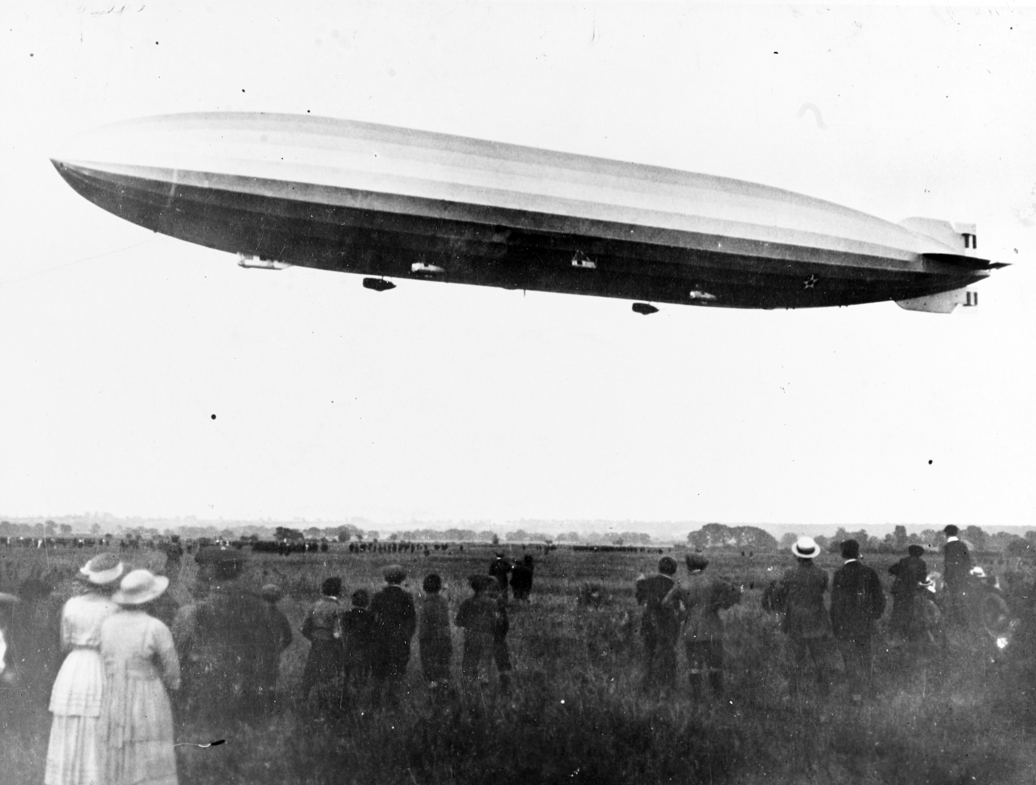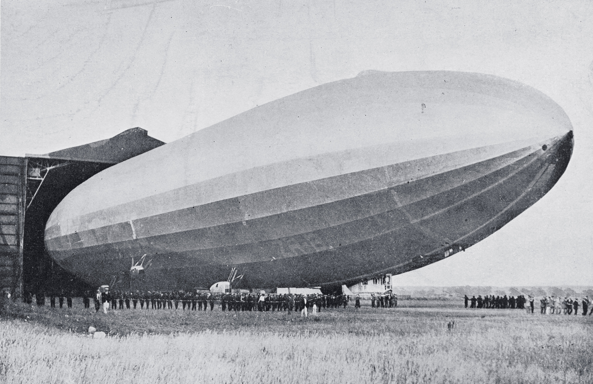 1.10M | British airship R-38 (U.S. Navy ZR-2) leaves its hangar during trials in England, circa June–August 1921. Note the faint marking "ZR-2" on the hull, near the control car. This is a fine-screen halftone reproduction. U.S. Naval History & Heritage Command photograph (# NH 42050). |