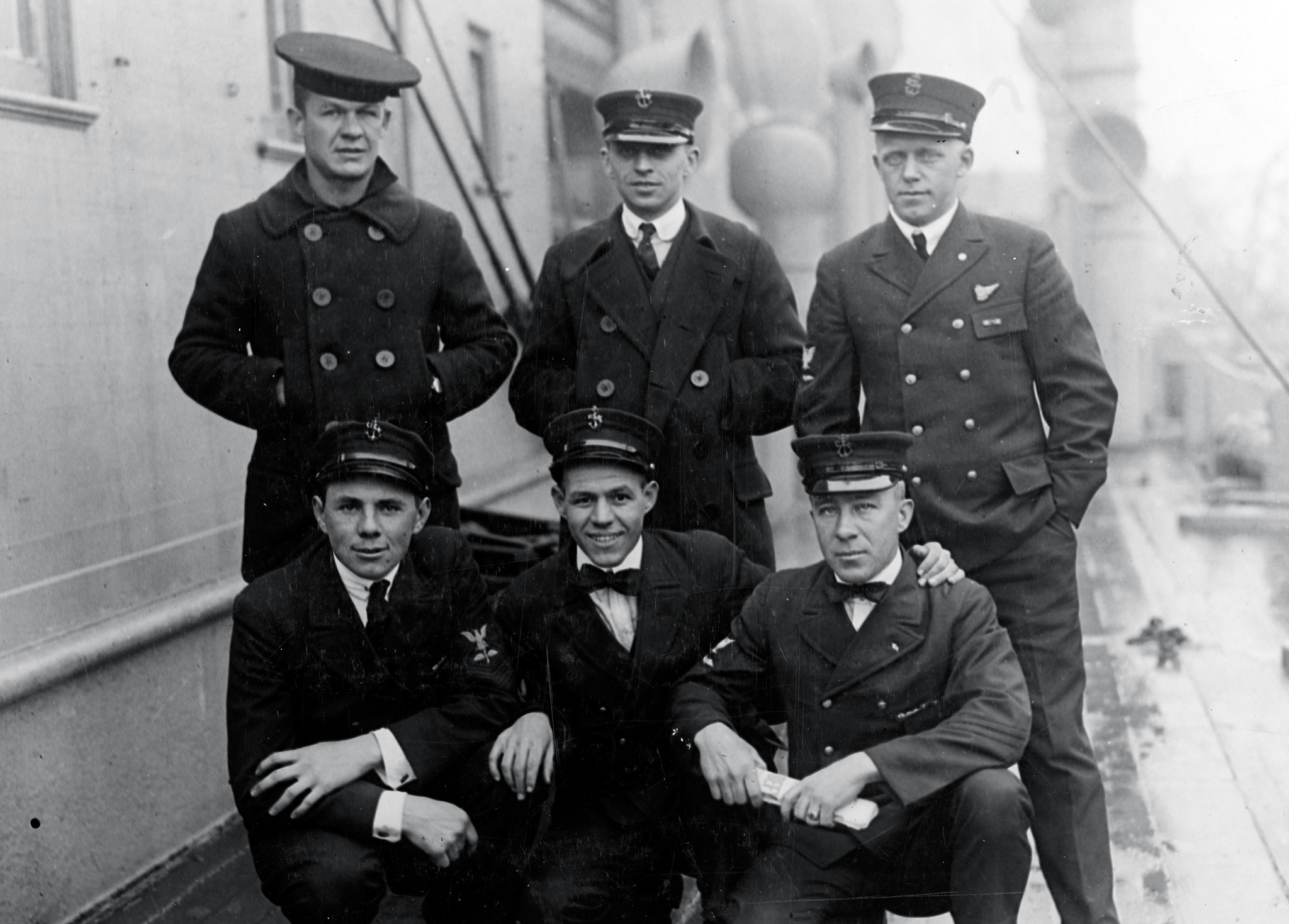 578k | Six U.S. Navy Petty Officers "sail to speed up work on the R-38. ... The R-38 is nearing completion in England and is to be flown to her hangar at Lakehurst, N.J." (quoted from the original caption). They are on board the passenger liner Princess Matoika (formerly USS Princess Matoika) for the trip to England, April 1920. These men are identified in the original caption as: Left to right, front: J.W. Cullinan, M. Lay and I.L. Thomas. Left to right, standing: N. Julnis [sic ?], A.B. Galation and H. Christensen. Chief Boatswain's Mate M. Lay and Chief Machinist's Mate W.A. Julius were among those who lost their lives when the R-38 crashed on 24 August 1921. U.S. Naval History & Heritage Command photograph (# NH 41997). |