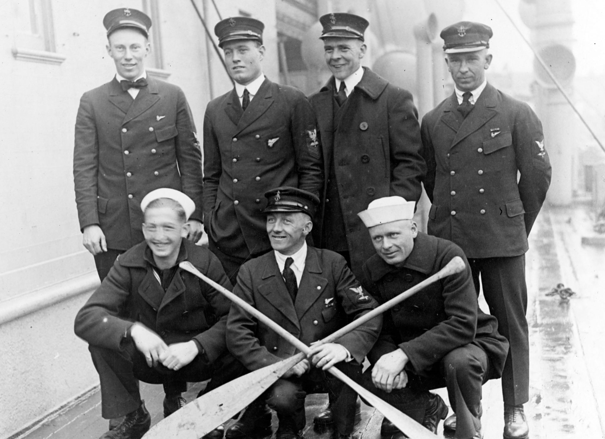 361k | "To fly the R-38 here. Leaving on the Princess Matoika to bring home via the air the R-38 now being built over there for the United States." (Quoted from the original caption). They are on board the passenger liner Princess Matoika (formerly USS Princess Matoika) for the trip to England, where the airship was under construction, April 1920. These men are identified in the original caption as: Left to right, kneeling: S.H. Knight, F.M. Gorey and A.C. Carlson. Left to right, standing: W.G. Steele, F.L. Stevens, W.A. Russell and R.N. Coons. Chief Machinist's Mates W.J. Steele and R.M. Coons were among those who lost their lives when the R-38 crashed on 24 August 1921. U.S. Naval History & Heritage Command photograph (# NH 41998). |