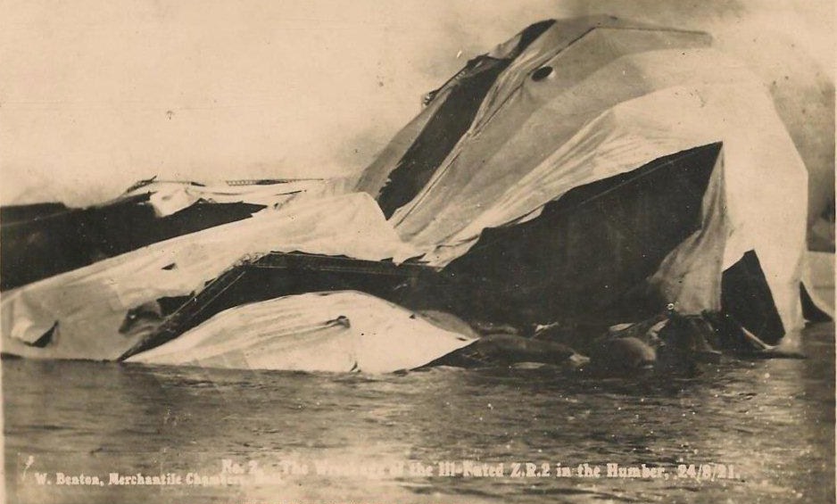 108k | "No. 2. The wreckage of the ill-fated ZR-2 in the Humber, 24/8/21." W. Benton, Merchantile Chambers, Hull. |