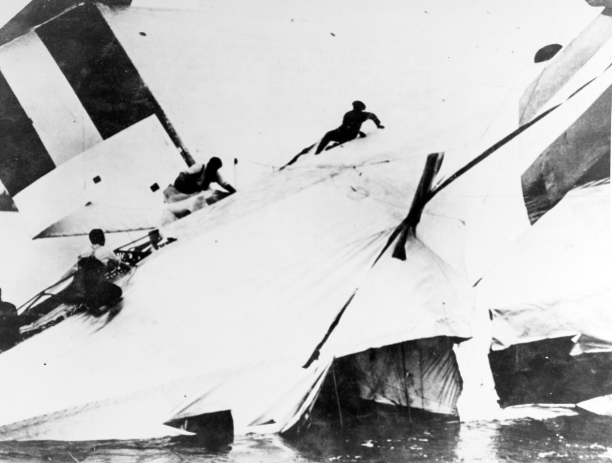 350k | Crash of British airship R-38 (U.S. Navy ZR-2), 24 August 1921. Rescue party cutting into the fabric hull covering, near the tail, in an effort to save airmen trapped in the wreckage, "scarcely one-half hour" after the airship broke up, exploded and crashed into the Humber River at Hull, England. U.S. Naval History & Heritage Command photograph (# NH 69230). |