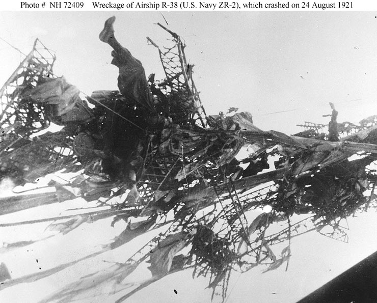 240k | Crash of British airship R-38 (U.S. Navy ZR-2), 24 August 1921. The airship's wreckage in the Humber River at Hull, Yorkshire, England, after it had broken up in the air, exploded and crashed. The tail is at the left. Courtesy of Carl S. Walters, 1970. U.S. Naval History & Heritage Command photograph (# NH 72408). |