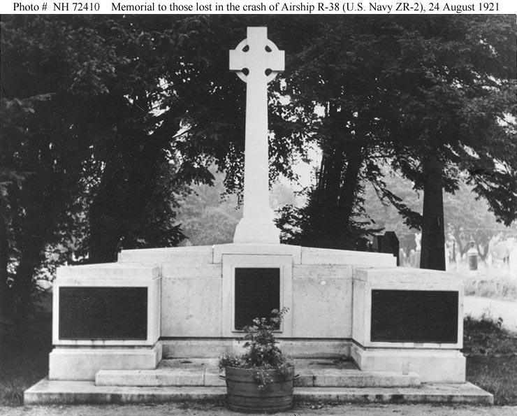 93k | Crash of British airship R-38 (U.S. Navy ZR-2, 24 August 1921. Memorial at Hull, Yorkshire, England, erected in honor of those lost when the airship broke up in the air, exploded and crashed into the Humber River off Hull. Of the 49 men aboard, including 17 Americans, 44 lost their lives. Courtesy of Carl S. Walters, 1970. U.S. Naval History & Heritage Command photograph (# NH 72410). |