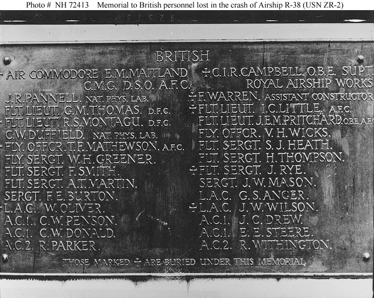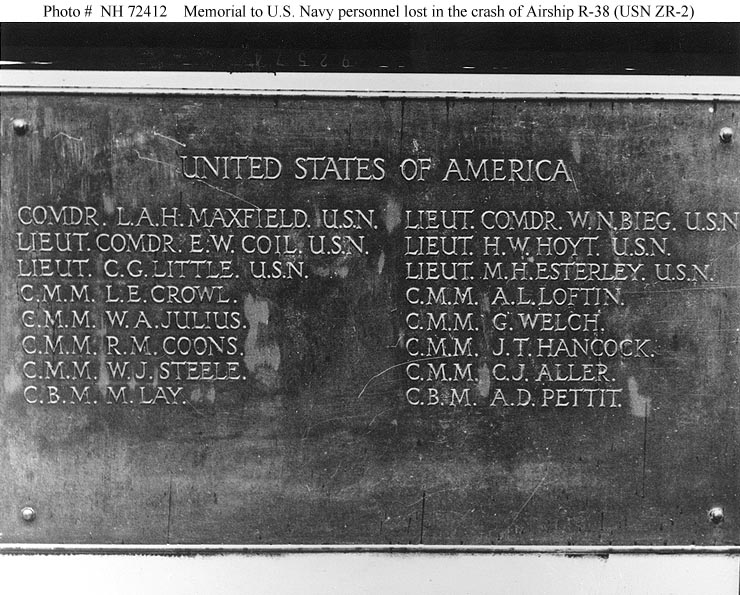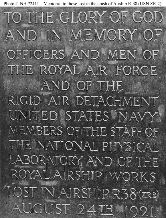 128k | Crash of British airship R-38 (U.S. Navy ZR-2, 24 August 1921. Plaque listing U.S. Navy personnel killed when the airship broke up in the air, exploded and crashed into the Humber River off Hull, Yorkshire, England. The plaque is part of a memorial erected at Hull in honor of the dead. Of the 49 men on board, including 17 Americans, 44 lost their lives. This plaque contains the names of 16 officers and men of the U.S. Navy. Courtesy of Carl S. Walters, 1970. U.S. Naval History & Heritage Command photograph (# NH 72412). |