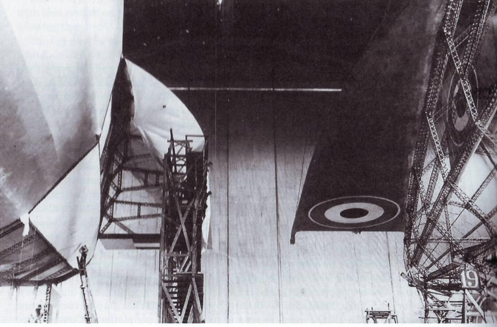 97k | Airship R38, at left, in the Cardington shed completing as the US Navy ZR-2, and the uncompleted R37 awaiting disposal on the right. Courtesy of the Airship Heritage Trust of Cardington, Bedforshire taken from Military, Naval and Civil Airships Since 1783, by Daniel George Ridley-Kitts MBE. |