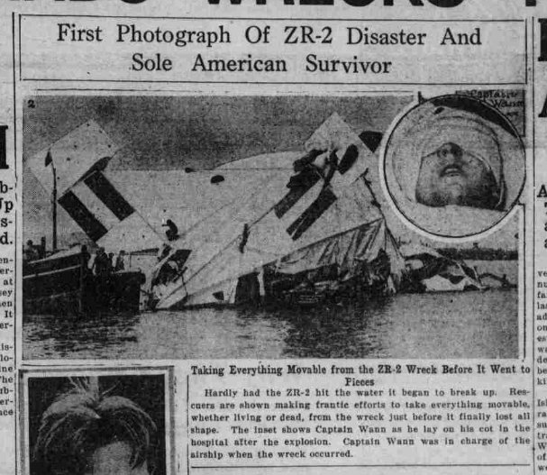 88k | "First Photograph Of ZR-2 Disaster And Sole American Survivor" "Taking Everything Movable from the ZR-2 Wreck Before It Went to Pieces" "Hardly had the ZR-2 hit the water it began to break up. Rescuers are shown making frantic efforts to take everything movable, whether living or dead, from the wreck just before it finally lost all shape. The inset shows Captain Wann as he lay on his cot in the hospital after the explosion. Captain Wann was in charge of the airship when the wreck occurred." Capital Journal, Salem, Oregon, Saturday, September 10, 1921. |