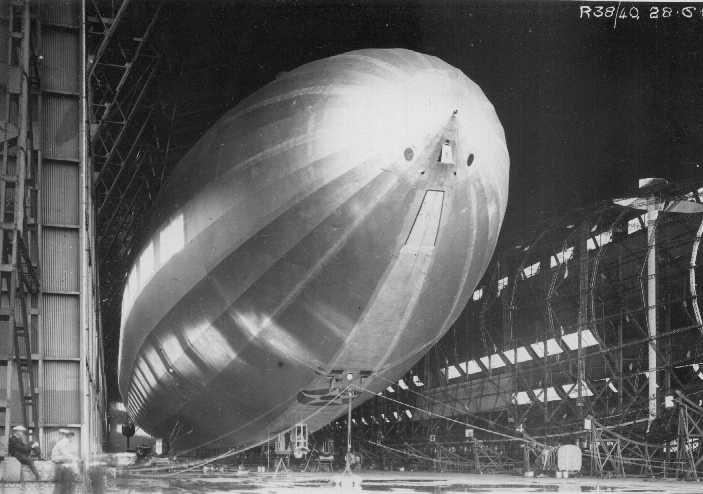 72k | Airship R38 (U.S. ZR-2) leaving the Cardington shed for trials, June 1921. Courtesy of the Airship Heritage Trust of Cardington, Bedforshire taken from Military, Naval and Civil Airships Since 1783, by Daniel George Ridley-Kitts MBE. |