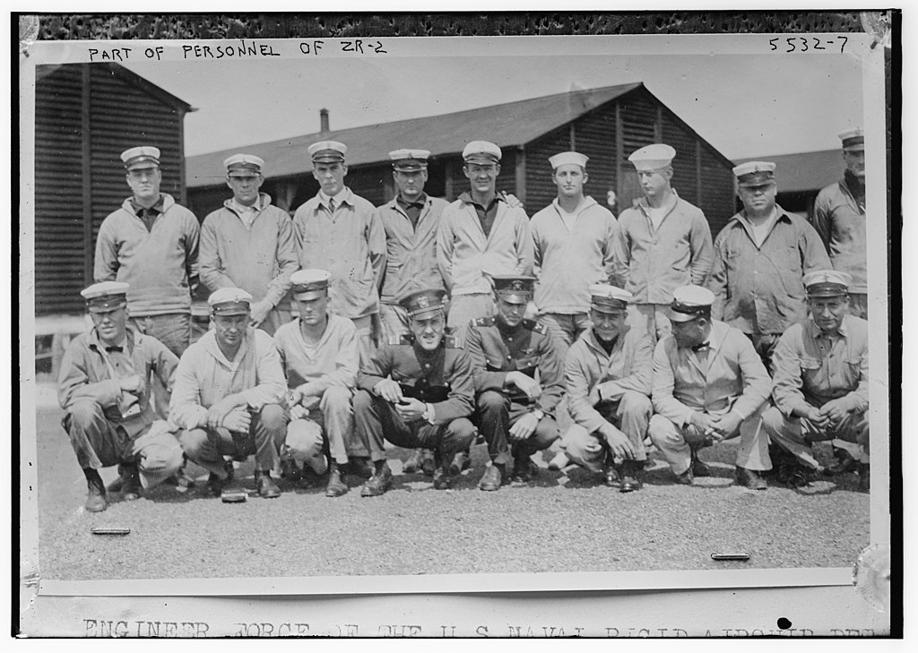 173k | Crew members of the British/U.S. Navy R-38/ZR-2 airship. It crashed during trials off the shore of Hull, England, 24 August 1921. Library of Congress Prints and Photographs Division, George Grantham Bain Collection. Digital ID: ggbain.32942. |