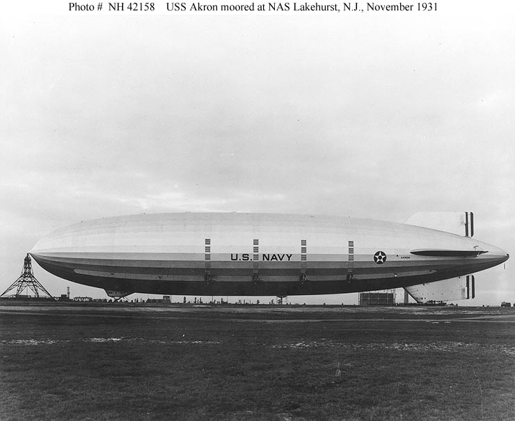 58k | USS Akron (ZRS-4) moored at Naval Air Station Lakehurst, New Jersey, 2 November 1931. Official U.S. Navy photograph, from the collections of the Naval History & Heritage Command (# NH 42158). |