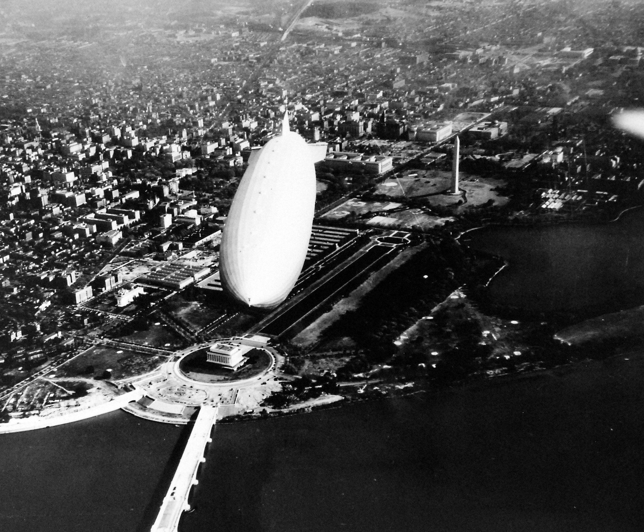 828k | USS Akron (ZRS-4) over Lincoln Memorial, Washington, D.C., 2 November 1931. Photograph received 1957. Note, the photograph is curved. Official U.S. Navy Photograph, now in the collections of the National Archives and Records Administration (NARA), # 80-G-1009363). |