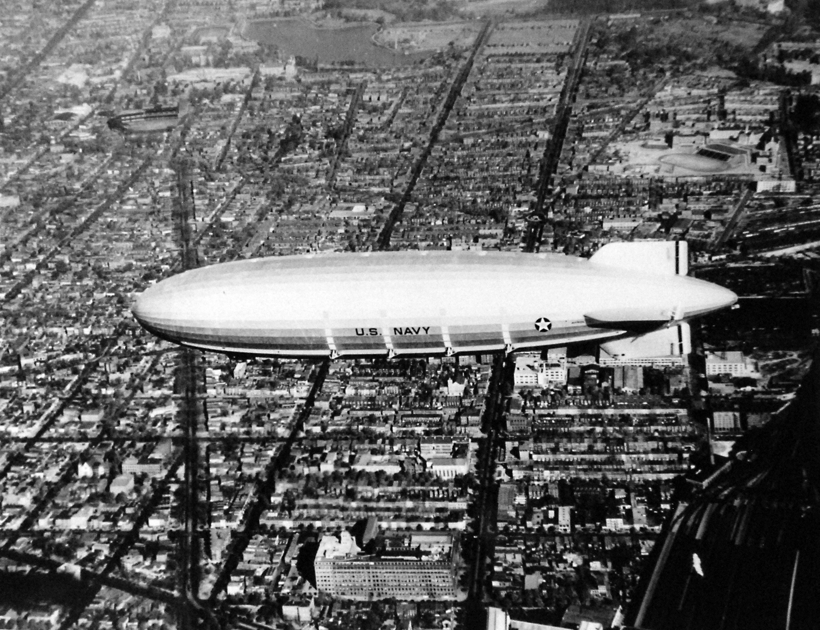 356k | USS Akron (ZRS-4) over San Francisco, California, 1932–33. Photograph received 1957. Note that the photograph is curved. Official U.S. Navy photograph, now in the collections of the National Archives and Records Administration (NARA), # 80-G-1009359. |