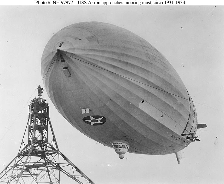 70k | USS Akron (ZRS-4) approaches a mooring mast while landing, circa 1931–1933. U.S. Naval History & Heritage Command photograph (# NH 97977). |