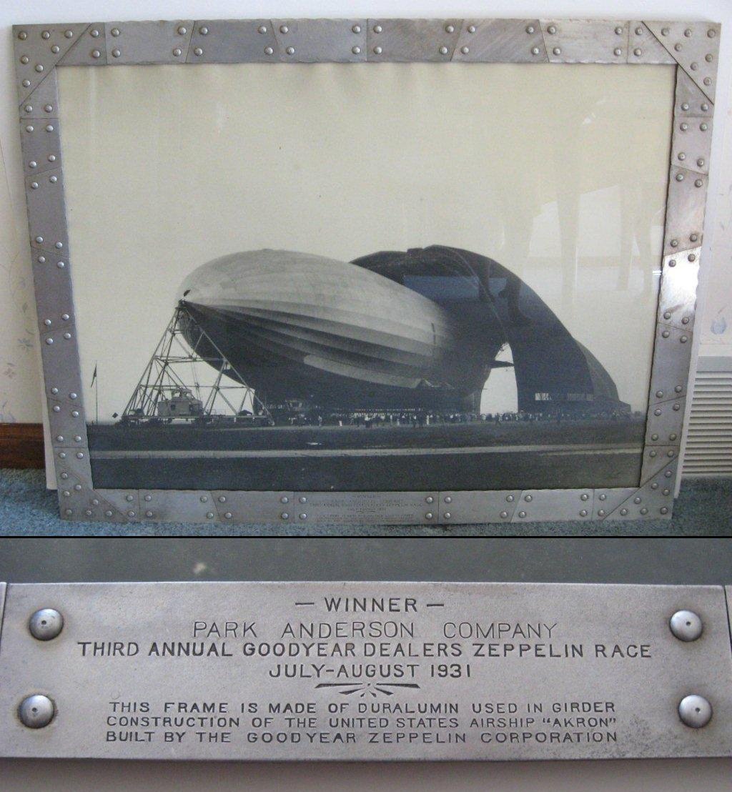 187k | "— WINNER — Park Anderson Company, Third Annual Goodyear Dealers Zeppelin Race, July–August 1931." "This frame is made of duralumin used in girder construction of the United States airship Akron built by the Goodyear Zeppelin Corporation." Same photo as above. |