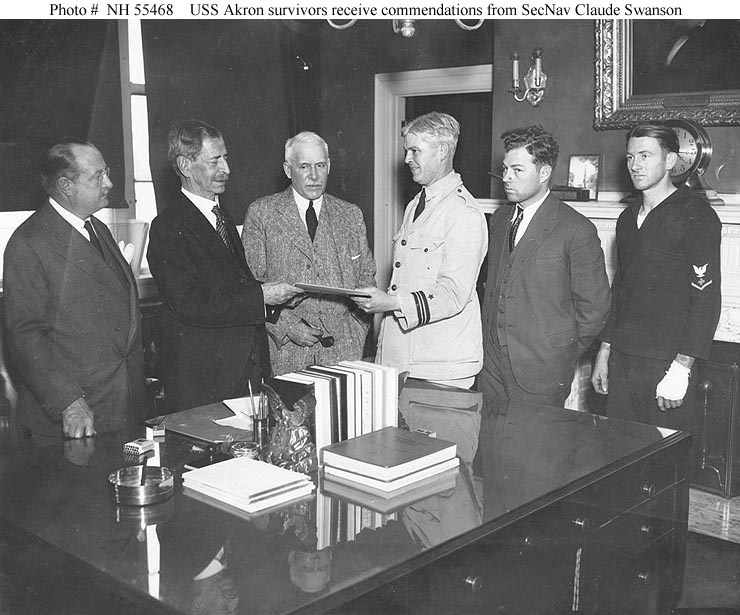 90k | Survivors of USS Akron (ZRS-4) receive commendations from the Secretary of the Navy, in his Navy Department office, shortly after the airship's loss on 4 April 1933. Those present are (from left to right): Assistant Secretary of the Navy Henry A. Roosevelt; Secretary of the Navy Claude Swanson; Admiral William V. Pratt, Chief of Naval Operations; Lieutenant Commander Herbert V. Wiley, senior survivor; Boatswain's Mate 2nd Class Richard E. Deal, survivor; and Aviation Metalsmith 2nd Class Moody Erwin, survivor. Erwin, whose left hand is bandaged, is apparently wearing a borrowed uniform, as its insignia is that of a Hospital Corpsman 3rd Class. U.S. Naval History & Heritage Command photograph (# NH 55468). |