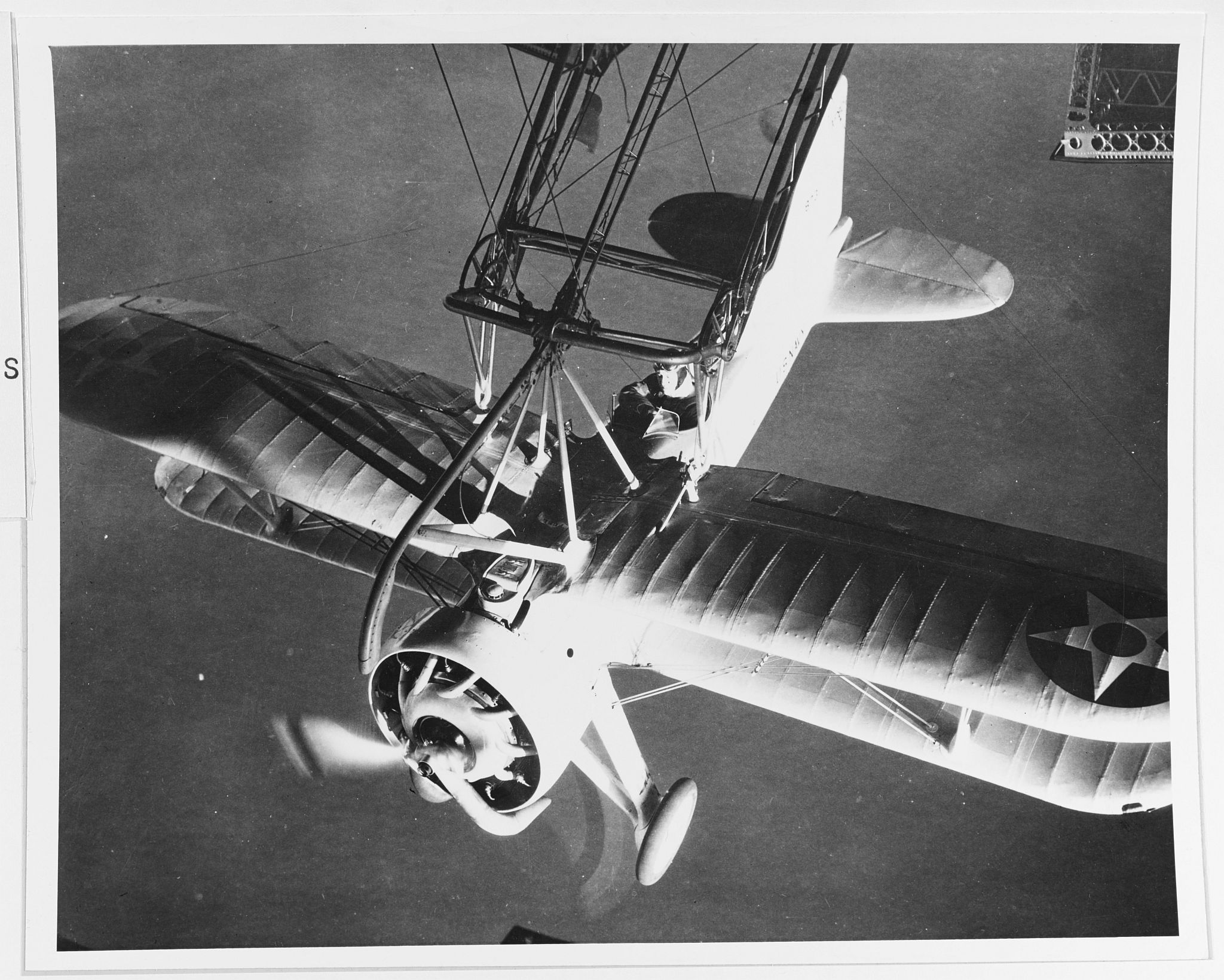 442k | Curtiss XF9C-1 Sparrowhawk (#A8731) is lifted into the hangar of USS Akron (ZRS-4), after hooking onto the airship's trapeze landing gear, 3 May 1932. Photographed during exercises over the Atlantic Ocean near Naval Air Station Lakehurst, New Jersey. Pilot is Lieutenant Howard L. Young. Official U.S. Navy Photograph, now in the collections of the National Archives and Records Administration (photo # 80-G-416534). |
