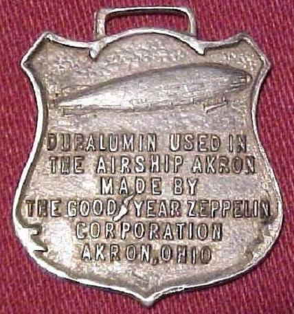 62k | Watch fob. "Duralumin used in the airship Akron made by the Good Year Zeppelin Corporation Akron, Ohio." |