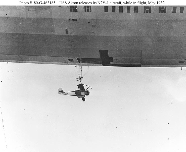 83k | USS Akron (ZRS-4) recovers her N2Y-1 airplane, during training exercises, circa 1932. Courtesy of Donald M. McPherson, 1976. U.S. Naval History and Heritage Command Photograph (# NH 84208). |