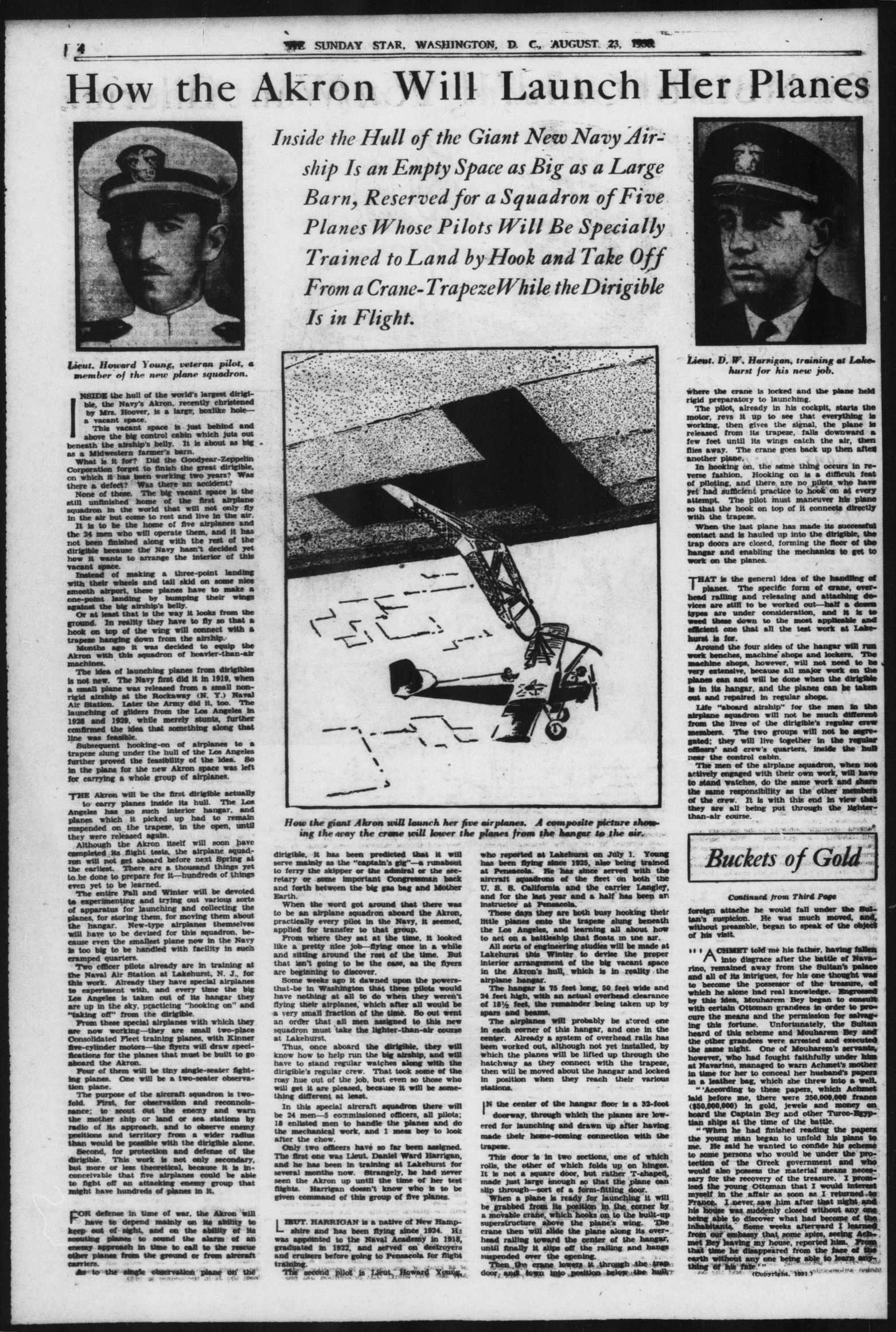 788k | "How the Akron Will Launch Her Planes—Inside the Hull of the Giant New Navy Airship Is an Empty Space as Big as a Large Barn, Reserved for a Squadron of Five Planes Whose Pilots Will Be Specially Trained to Land by Hook and Take Off From a Crane-Trapeze While the Dirigible Is in Flight." The Sunday Star, Washington, D. C., Sunday, 23 August 1931, page 4. |