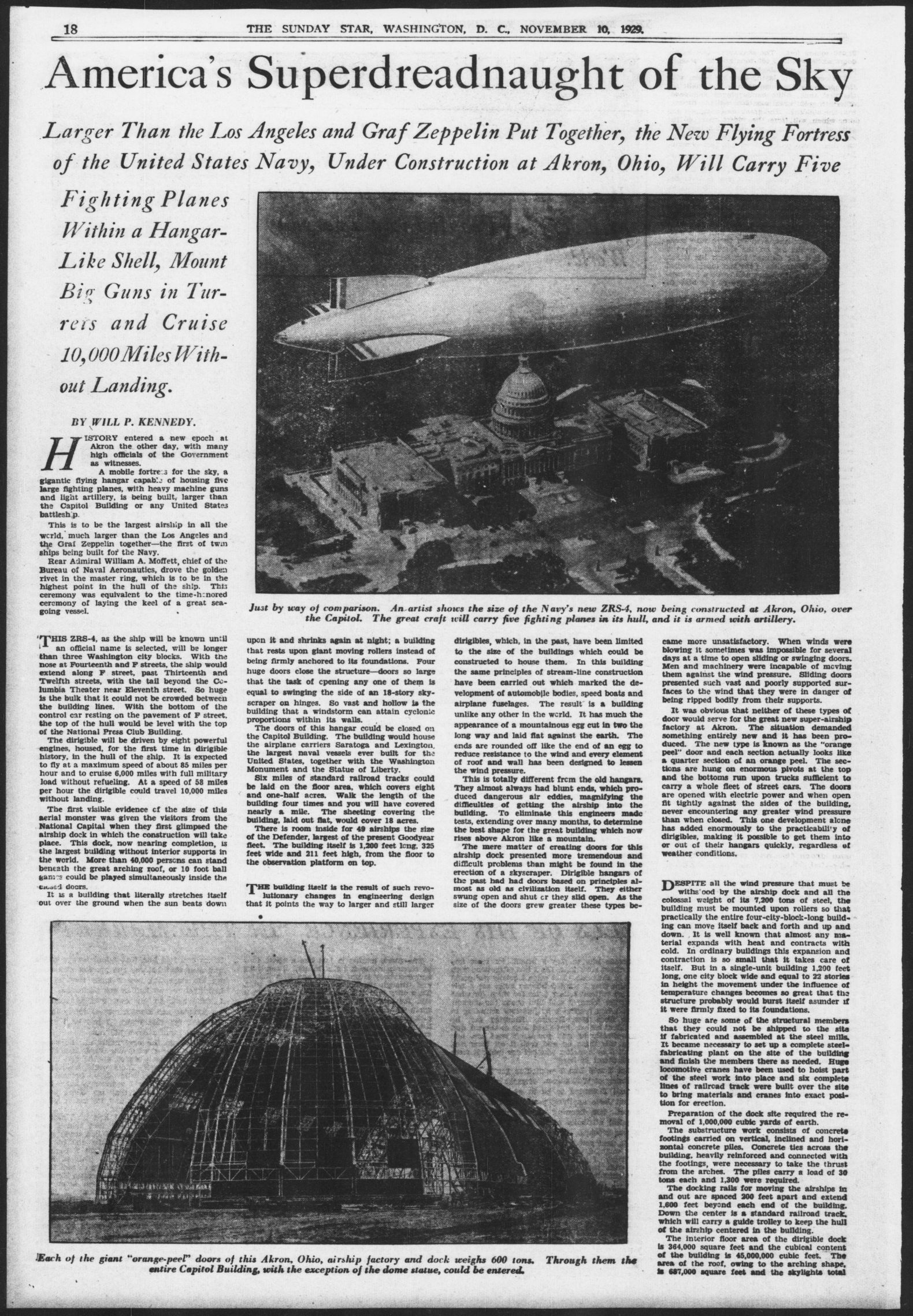 805k | "America's Superdreadnaught of the Sky—Larger Than the Los Angeles and Graff Zeppelin Put Together, the New Flying Fortress of the United States Navy, Under Construction at Akron, Ohio, Will Carry Five Fighting Planes Within a Hangar-Like Shell, Mount Big Guns in Turrets and Cruise 10,000 Miles Without Landing." The Sunday Star, Washington, D.C., Sunday, 10 November 1929. |