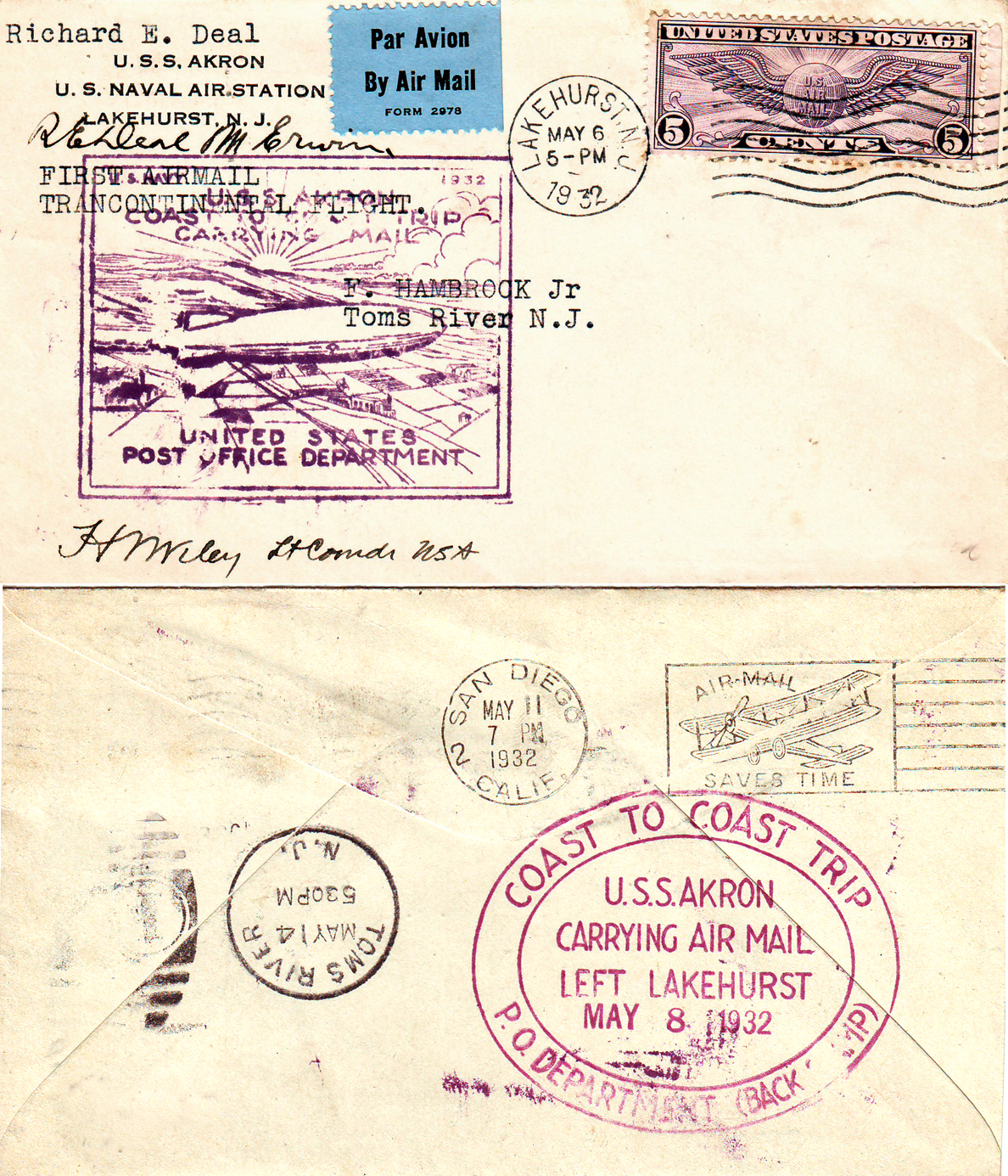 1.95M | USS Akron (ZRS-4) cover carried on the May 1932 "Coast to Coast" Air Mail flight and later autographed by the only three survivors of the April 1933 crash: LCDR Herbert V. Wiley, AM2 Moody Erwin, and BM2 Richard E. Deal. Source: The Cooper Collection of Zeppelin Postal History. Image: DigitalImageServices.com. |