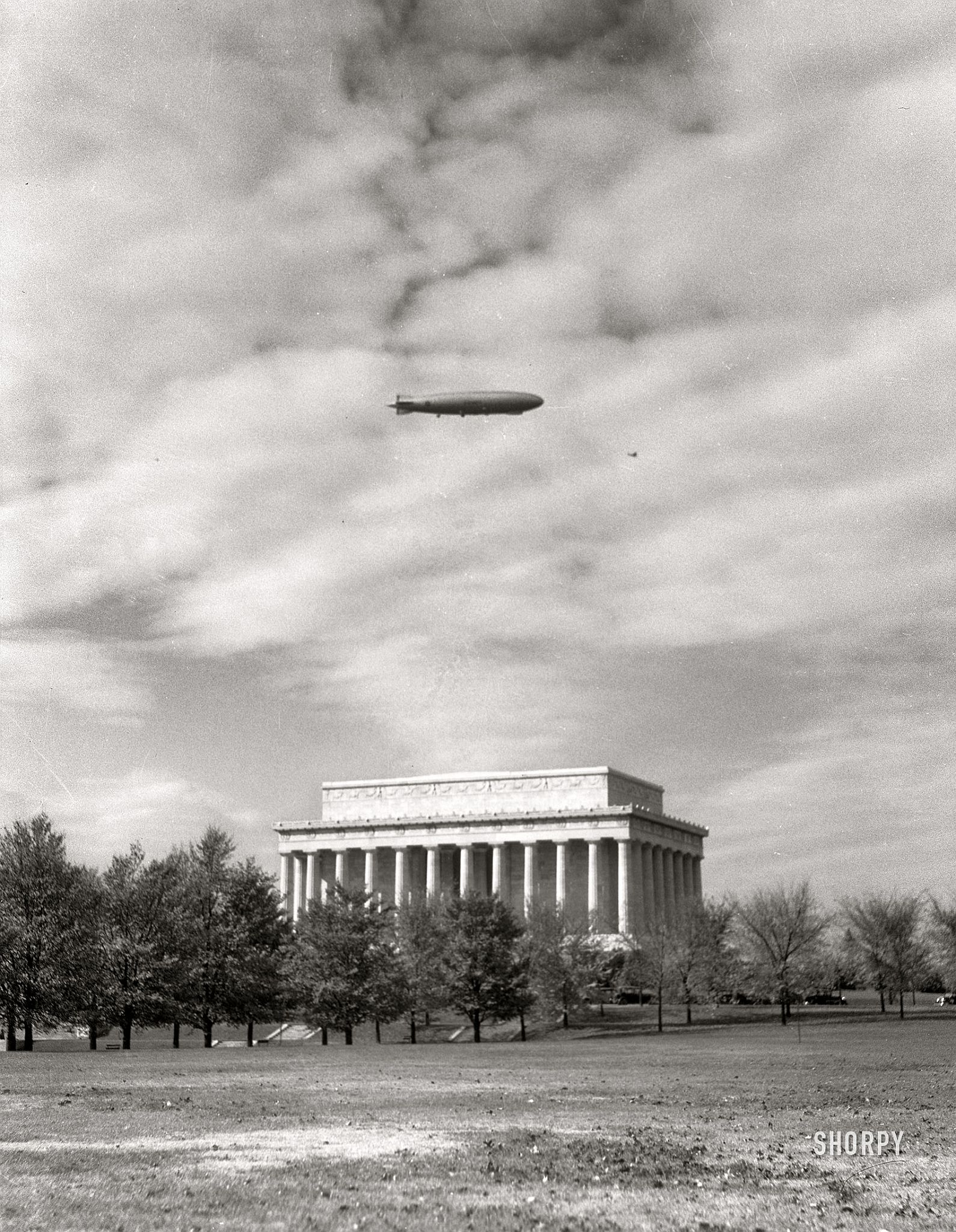 673k | The Lincoln Memorial in Washington, D.C., 19 August 1932. 4x5 inch nitrate negative by Theodor Horydczak. "The Navy airship Akron appeared in the morning and after circling the city released several of her small fighting airplanes over Hoover Field. These were later drawn into the hangar constructed on the interior of the airship." |