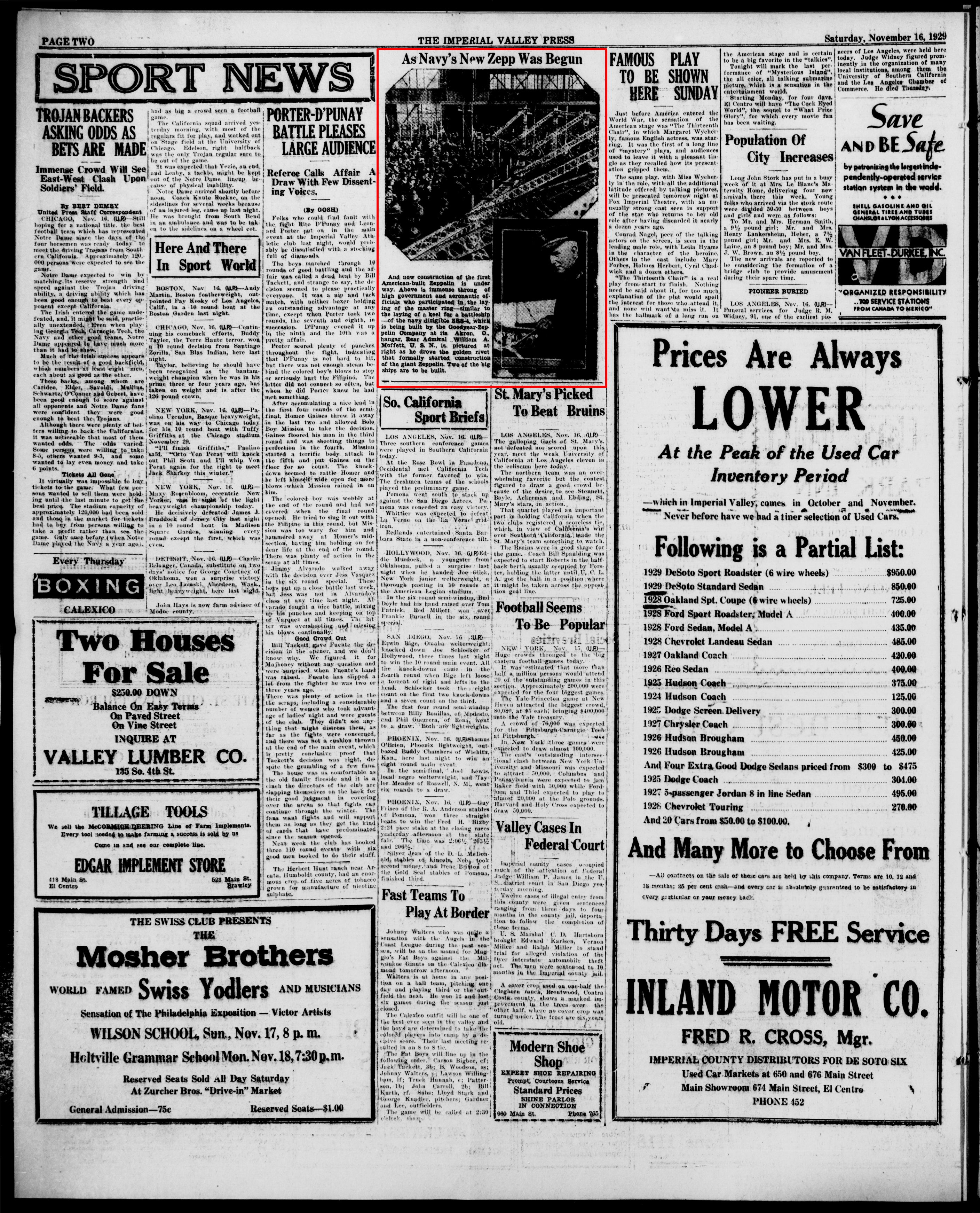 2.03M | "As Navy's New Zepp Was Begun—And now construction of the first American-built Zeppelin is under way. Above is immense throng of high government and aeronautic officials who participated in the laying of the master ring—similar to the laying of keel for a battleship—of the navy dirigible ZRS-4, which is being built by the Goodyear-Zeppelin Company at its Akron, O., hangar. Rear Admiral William A. Moffett, U.S.N., is pictured at right as he drove the golden rivet that formally started construction of the giant Zeppelin. Two of the big ships are to be built." The Imperial Valley Press, El Centro, California, Saturday, 16 November 1929. |