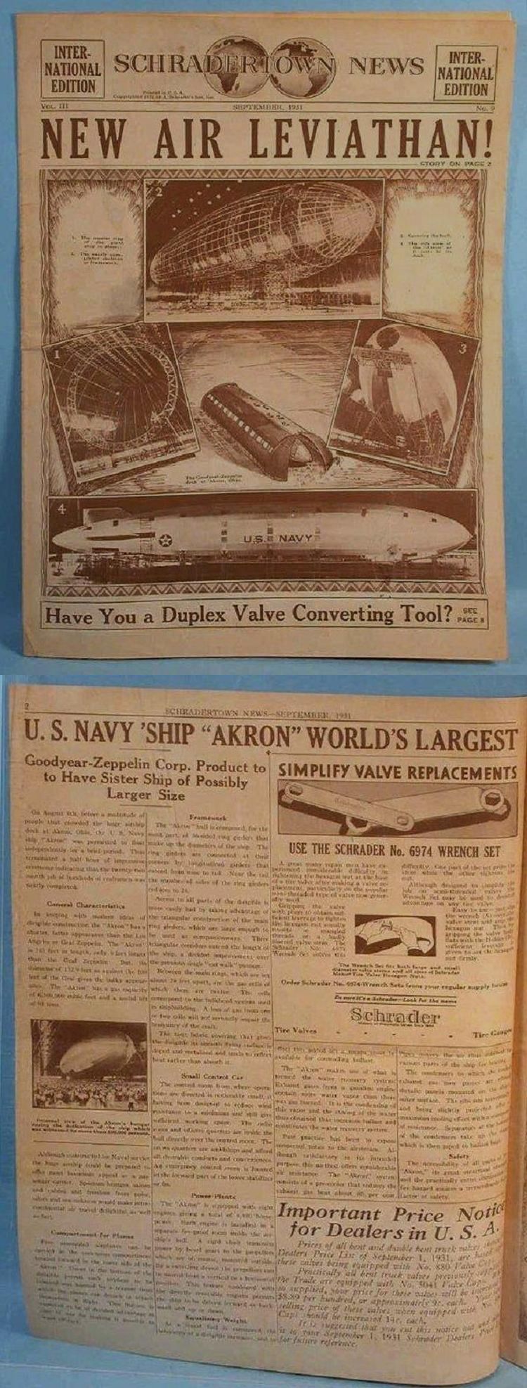 273k | Schradertown News tabloid with Goodyear Zeppelin photo story, September 1931, Vol. III, No. 9. Produced by the Schrader Tire Valve Company. This transportation-based newspaper publication is most notable for the cover photo story on the Goodyear Akron Zeppelin. |