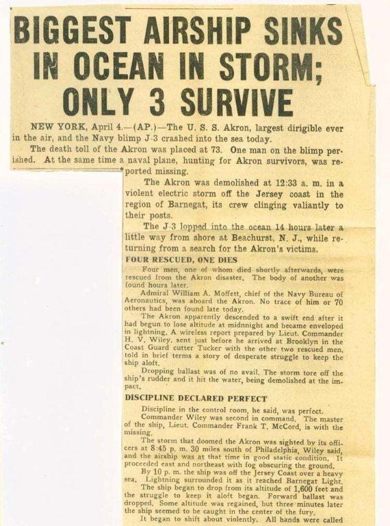 91k | "BIGGEST AIRSHIP SINKS IN OCEAN IN STORM; ONLY 3 SURVIVE" "NEW YORK, April 4.—(AP.)—The U.S.S. Akron, largest dirigible ever in the air, and the Navy blimp J-3 crashed into the sea today." "The death toll of the Akron was placed at 73. One man on the blimp perished. At the same time a naval plane, hunting for Akron survivors, was reported missing." "The Akron was demolished at 12:33 a.m. in a violent electric storm off the Jersey coast in the region of Barnegat, its crew clinging valiantly to their posts." "The J-3 lopped into the ocean 14 hours later a little way from shore at Beachurst, N.J., while returning from a search for the Akron's victims." [...] |