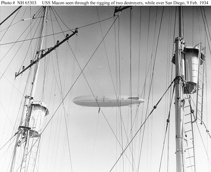 85k | USS Macon (ZRS-5) over San Diego harbor, California, 1934. Photographed from USS Dobbin (AD-3), through the rigging of two destroyers that were tied up alongside. Note lookout "crows' nests" on the destroyers' foremasts. This photograph is dated 9 February 1934, but was probably taken after March 1934, as one set of water recovery condensers has been removed from above Macon's engines. Donation of Franklin Moran, 1967. Naval History & Heritage Command photo (# NH 65303). |