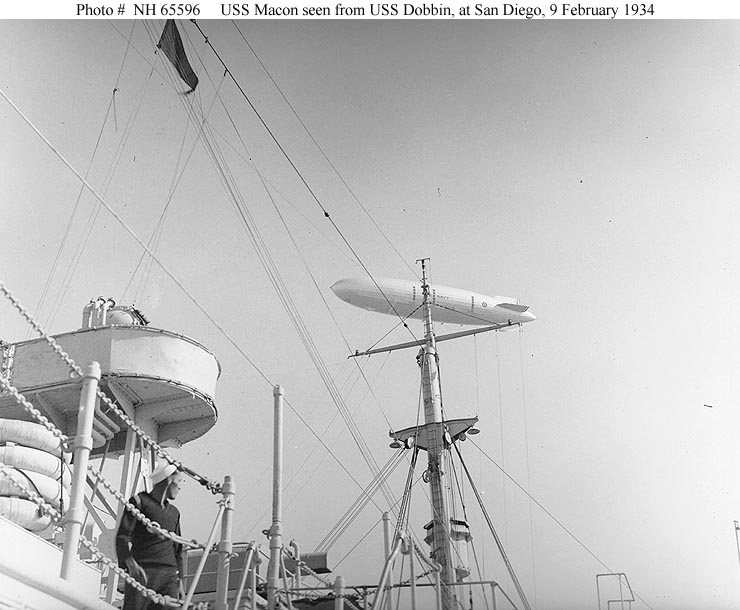 53k | USS Macon (ZRS-5) flying over San Diego harbor, California, 9 February 1934. Photographed from USS Dobbin (AD-3). Donation of Franklin Moran, 1967. Naval History & Heritage Command (NH&HC) photo, # NH 65306. |