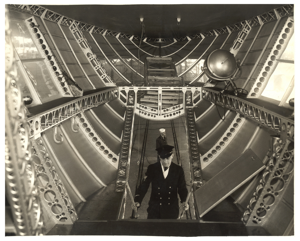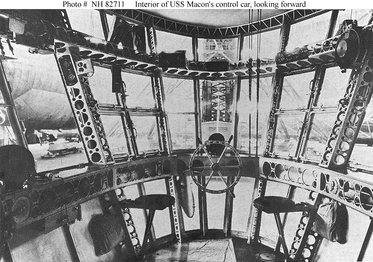 158k | View in the airship's control car, looking forward, while she was in a hangar, circa 1933–1935. This is a halftone reproduction. Naval History & Heritage Command photo (# NH 82711). |