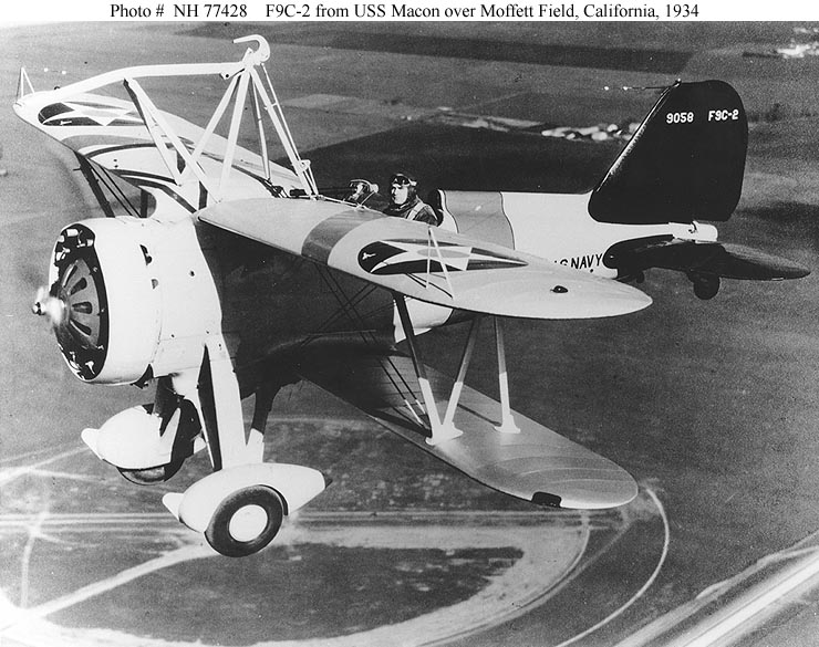 88k | Curtiss F9C-2 Sparrowhawk fighter, with its landing gear removed for airship operations, maneuvers near USS Macon (ZRS-5), while being filmed by Fox Movietone News cameras on 12 October 1934. The plane's pilot was Lieutenant (Junior Grade) Frederick N. Kivette, USN. Courtesy of Richard K. Smith, author of the book The Airships Akron & Macon, 1974. Naval History & Heritage Command photo (# NH 84571). |
