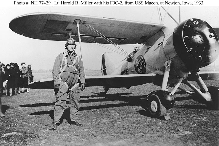 95k | Lieutenant Harold B. "Min" Miller, USN, with his Curtiss F9C-2 Sparrowhawk fighter, while visiting his hometown, Newton, Iowa, while en route from Lakehurst, New Jersey, to Moffett Field, California, in October 1933. The man in the plane's cockpit is Aviation Machinist's Mate 3rd Class Glowacki. Both men, and the aircraft, were part of the USS Macon (ZRS-5) heavier-than-air group. Macon was also en route to Moffett Field, but her Sparrowhawks were making the trip independently. Courtesy of Harold B. Miller, 1973. Naval History & Heritage Command photo (# NH 77429). |