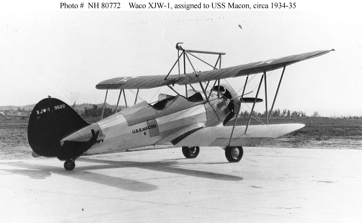50k | Waco XJW-1 utility airplane (Bureau # 9522) parked at an airfield, circa 1934–1935. This airplane was assigned to USS Macon (ZRS-5). Courtesy of Richard K. Smith, author of the book The Airships Akron & Macon, 1974. Naval History & Heritage Command photo (# NH 80772). |