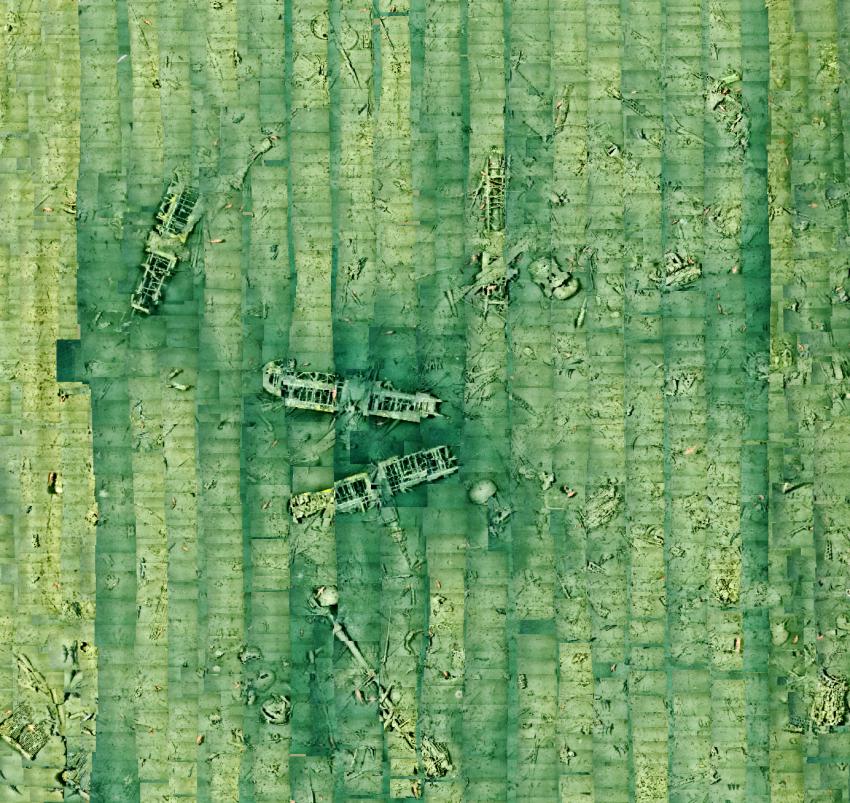 201k | This sophisticated photomontage shows the remains of USS Macon (ZRS-5) and her four fighters on the seabed. "The wreckage of the Macon and four aircraft lie at a depth of more than 1,500 feet and were first documented in 1990 by the Monterey Bay Aquarium Research Institute (MBARI). Monterey Bay National Marine Sanctuary conducted a sonar survey in 2005 followed by the first archaeological expedition in 2006 that documented the Macon's remains." "Commemorating the 75th anniversary of the loss of the U.S. Navy airship USS Macon, NOAA today [11 February 2010] announced that the wreck site on the seafloor within Monterey Bay National Marine Sanctuary has been added to the National Register of Historic Places." (More information available at the NOAA [National Oceanic and Atmospheric Administration] website.) |