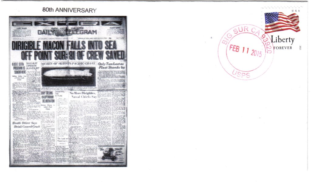 95k | "Dirigible Macon Falls into Sea off Point Sur: 81 of Crew Saved" 80th anniversary, dated 11 February 2015. |