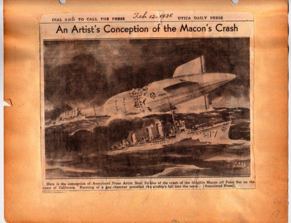144k | "An Artist's Conception of the Macon's Crash—Here is the conception of Associated Press Artist Noel Sickles of the crash of the dirigible Macon off Point Sur on the coast of California. Bursting of a gas chamber preceded the airship's fall into the water. [Associated Press]." The Utica Daily Press, Utica, NY, Tuesday, 12 February 1935. |