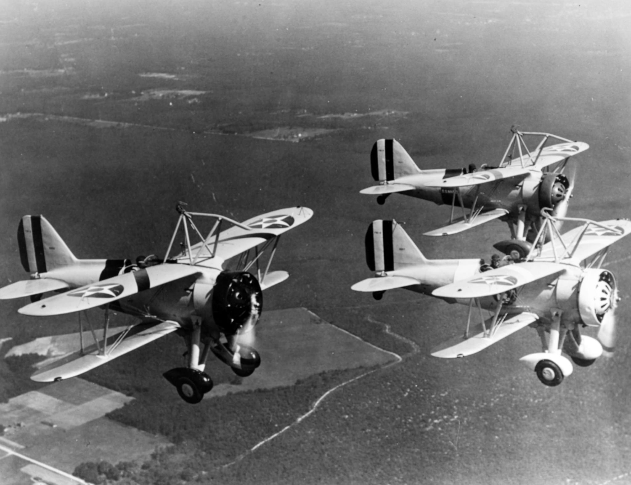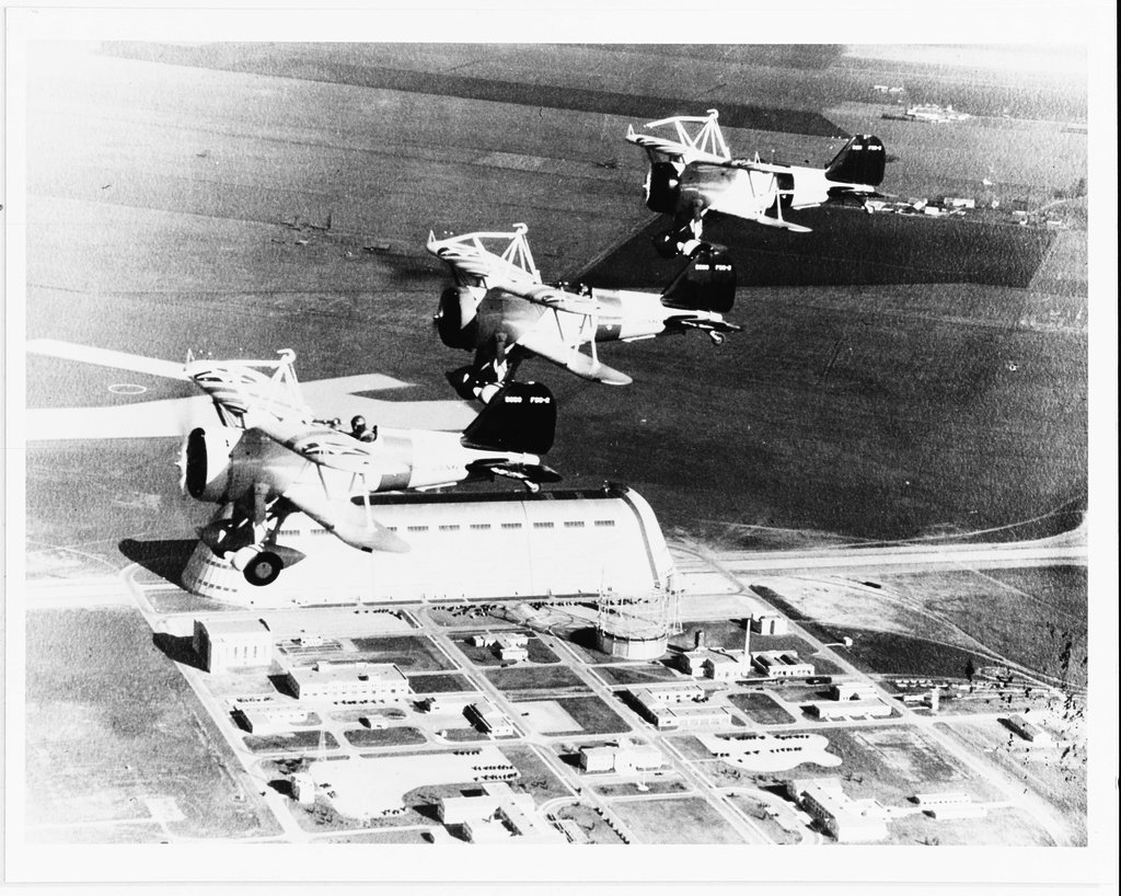 244k | Curtiss F9C-2 Sparrowhawk fighters (including # 9055, at left, and 9057, in lower right) flying in a V formation, circa 1933–1935. These planes were part of the heavier-than-air group of USS Macon (ZRS-5). Naval History & Heritage Command (NH&HC) photo, # NH 71617. |
