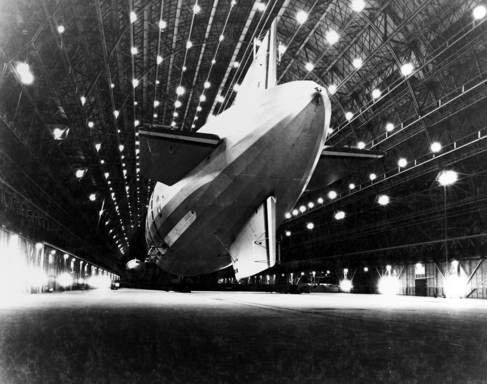 518k | USS Macon (ZRS-5) being docked in hangar at Naval Air Station Moffet Field, Sunnyvale, California, ca 1933–1934. National Archives photo. |