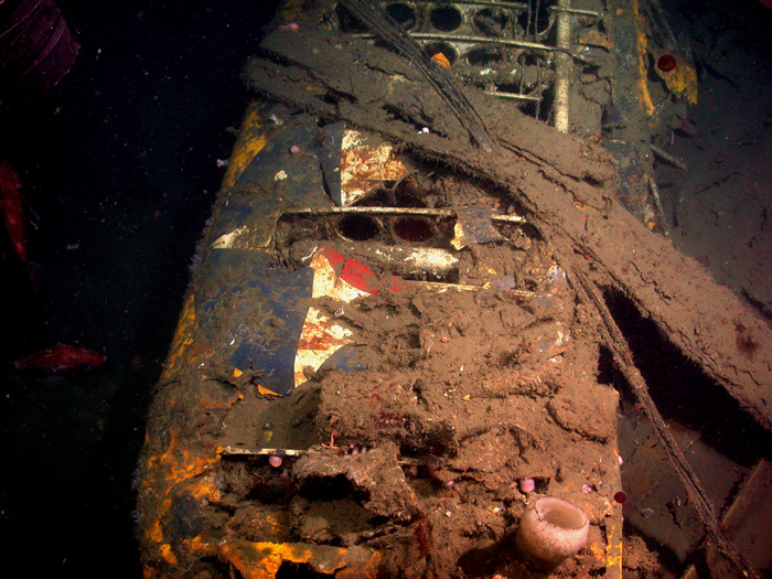 283k | The sky hook located at the center of the Curtiss Sparrowhawk F9C-2 biplanes. During flight, the pilot would position the aircraft below USS Macon's hangar where a trapeze was lowered to hook the plane. Sparrowhawk pilots were nicknamed the "men on the flying trapeze." As seen in the September 2006 expedition. Source: National Oceanic and Atmospheric Administration (NOAA), Photo No. Unknown. |