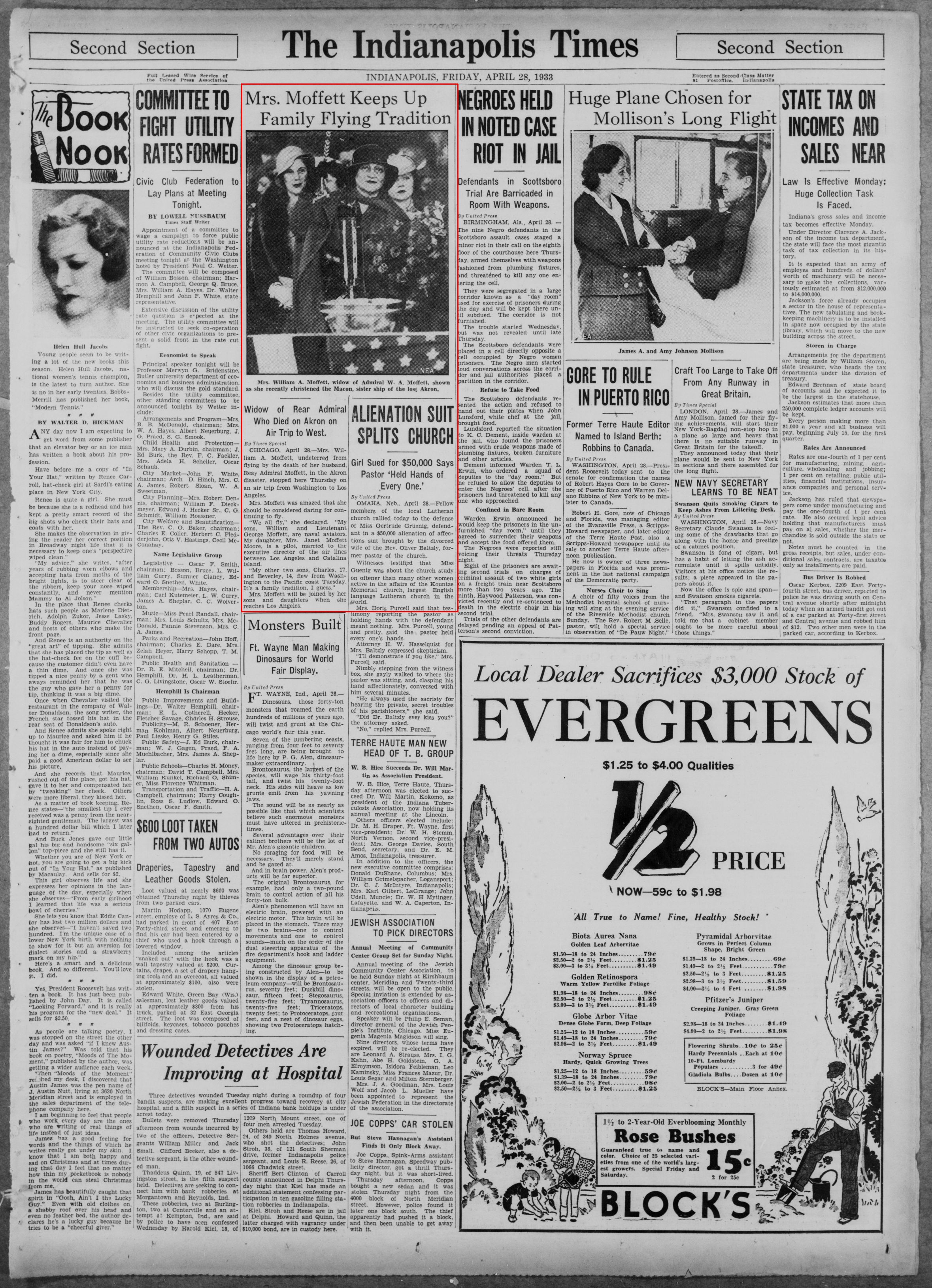 1.59M | "Mrs. Moffett Keeps Up Family Flying Tradition—Mrs. William A. Moffett, widow of Admiral W. A. Moffett, shown as she recently christened the Macon, sister ship of the lost Akron." "Widow of Rear Admiral Who Died on Akron on Air Trip to West—By Times Special—CHICAGO, April 28.—Mrs. William A. Moffett, undeterred from flying by the death of her husband, Rear Admiral Moffett, in the Akron disaster, stopped here Thursday on an air trip from Washington to Los Angeles." "Mrs. Moffett was amazed that she could be considered daring for continuing to fly." "'We all fly,' she declared, 'My sons, William and Lieutenant George Moffett, are naval aviators. My daughter, Mrs. Janet Moffett Moore, is a pilot, married to the executive director of the air lines between Los Angeles and Catalina Island.'" "'My other two sons, Charles, 17, and Beverly, 14, flew from Washington to the Pacific coast Tuesday. It's a family tradition, I guess.'" "Mrs. Moffett will be joined by her sons and daughters when she reaches Los Angeles." The Indianapolis Times, Friday, 28 April 1933. |