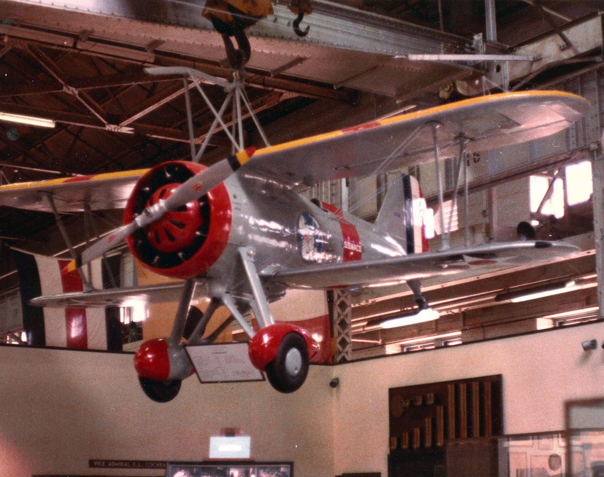 641k | An F-9C Sparrowhawk aircraft hanging in the Navy Memorial Museum (now National Museum of the U.S. Navy). Building 76, Washington Navy Yard, 1975. National Museum of the U.S. Navy (NMUSN) Photograph Collection, # NMUSN-4393. |
