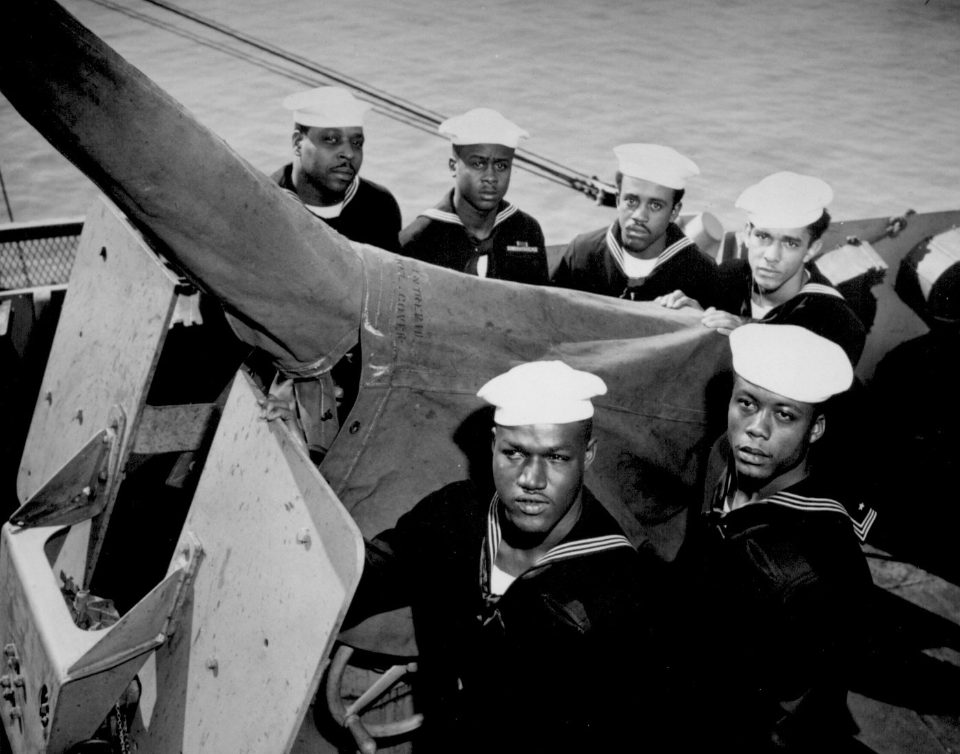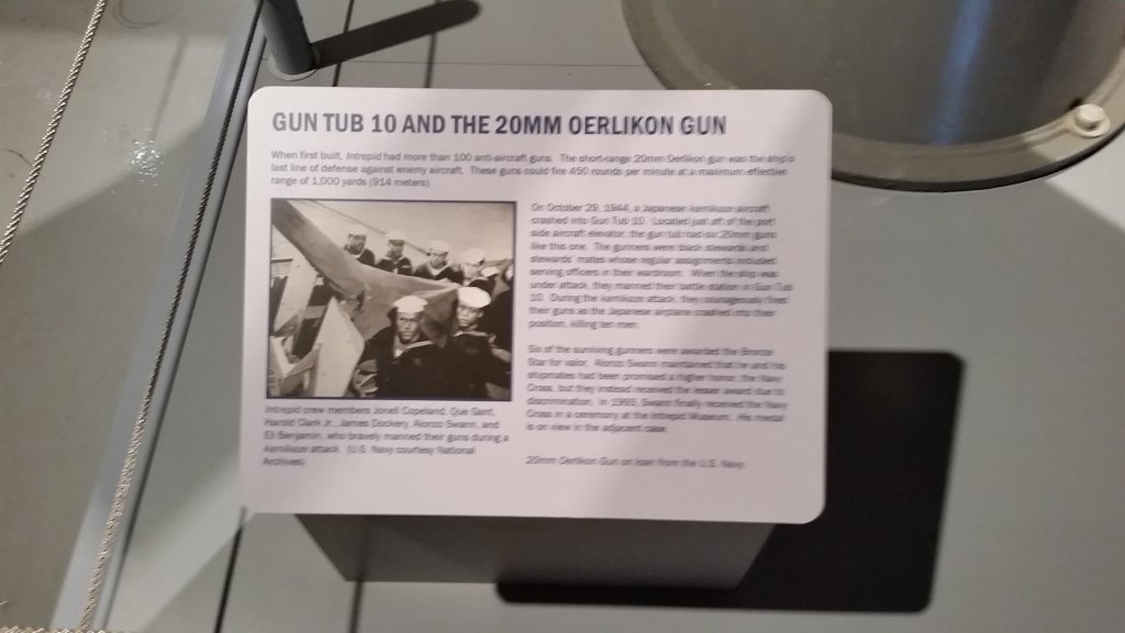 ![]() NS-cv11-mn022 "During World War II, African Americans were not initially accepted for combat duty, and instead typically served as cooks or waiters in the officers’ mess. However, many requested and received volunteer combat assignments in addition to their regular duties. On the Intrepid, these volunteers were given their own battle station called Gun Tub 10. Their weapons were 20mm Oerlikon guns, the shortest-range of the Intrepid's anti-aircraft guns." "On October 29, 1944, during combat in the Philippines, a Japanese kamikaze airplane barreled toward Gun Tub 10. The gunners stayed at their battle station and fired at the incoming aircraft, shooting away its left wing. The damaged plane crashed into their position, killing 10 men and badly burning others. Six of the surviving sailors were awarded the Bronze Star for valor: Jonell Copeland, Que Gant, Harold Clark Jr., James Dockery, Alonzo Swann, and Eli Benjamin." "Alonzo Swann always maintained that he had been promised a higher honor, the Navy Cross. In 1993, 49 years after the kamikaze attack, Swann finally received the Navy Cross in a ceremony aboard the Intrepid. His medal and citation are on view in our galleries, as well as a 20mm gun like the ones that Swann and his fellow gunners used. Four other black sailors also received the Navy Cross for their bravery during that attack: James Dockery, Que Gant, Robert Jones and Eugene Smith." (Quoted from Gun Tub 10.) (61Kb) (Click here for a larger, clearer photo of the Gun Tub 10 crew.) |