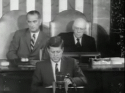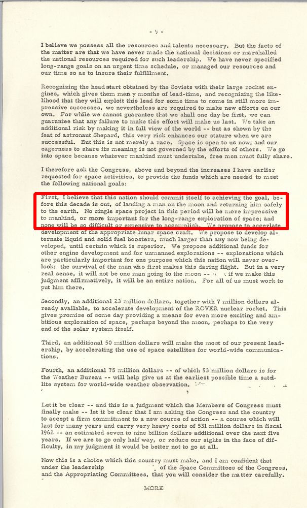 156k | During an address to Congress in May 1961, President John F. Kennedy declared the nation should commit itself to landing a man on the moon, and returning him safely to the earth, before the end of the decade. Clearly, it was a challenge to the Soviet Union for world leadership in the science and technology fields. "First, I believe that this nation should commit itself to achieving the goal, before this decade is out, of landing a man on the moon and returning him safely to the earth. No single space project in this period will be more impressive to mankind, or more important for the long-range exploration of space; and none will be so difficult or expensive to accomplish." NS-ha-001a: Video clip, 41" length (.mp4 format). NS-ha-001b: Page 9 of President Kennedy's Special Message to the Congress on Urgent National Needs, 25 May 1961. |