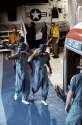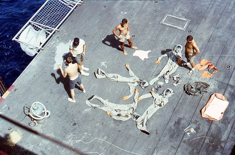 114k | After a SIMEX, all teams involved had to clean, dry and prepare their equipment for the next practice session. In this case, the UDT-11 swimmers have washed their BIG suits and are drying them on an elevator. They are also discussing the results of the SIMEX with a NASA person. Photo by Don Blair. |